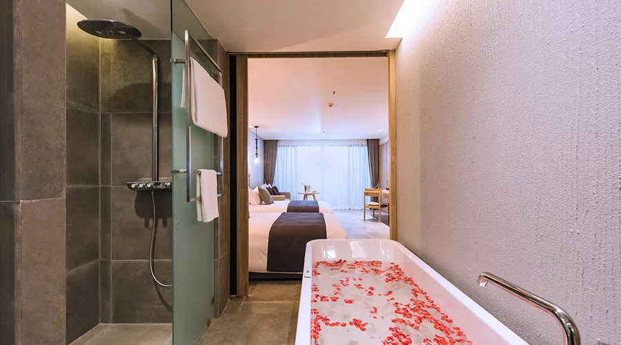 This is where tropical style and comfort live side by side. As the name tells, every room features a private access to the pool and an outdoor Jacuzzi. Other comforts in this room type include a large, comfortable bed, couch, spacious bathroom with a walk-in shower and separate toilet.