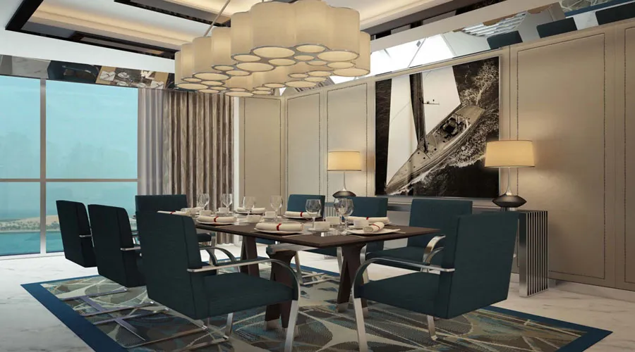 The Royal M Suite stands out with floor-to-ceiling windows showcasing sweeping views of the Arabian Gulf. Complete with a stylish living room, dining space, and two luxurious bedrooms, this suite embodies opulence.